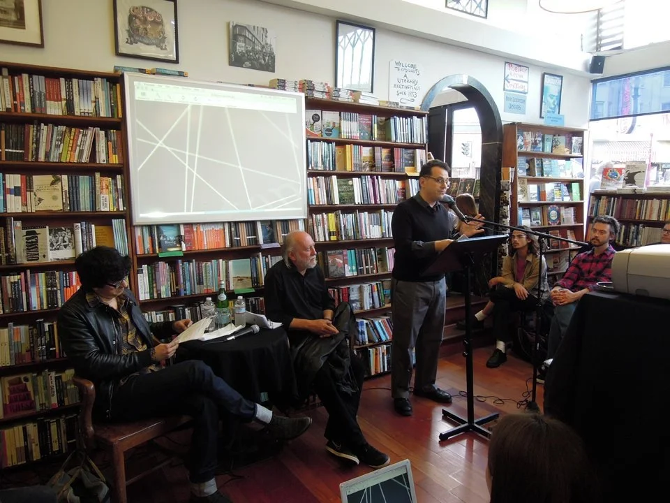 Peter Maravelis (right) introduces László Krasznahorkai (center) and Mauro Javier Cardenas (left) at City Lights Books on June 27, 2013.
